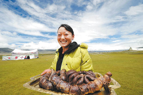 8月24日,在青藏公路和青藏鐵路旁邊的藏北當(dāng)雄縣牧民達(dá)瓦多吉開辦的牧民旅游度假村,牧民把剛剛煮好的藏式血腸端上來。目前,旅游業(yè)已成為西藏許多農(nóng)牧民新的致富手段。