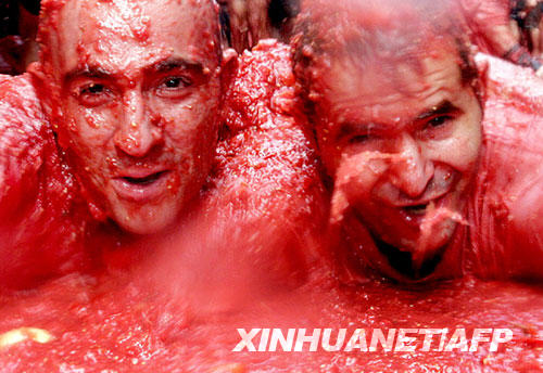 8月27日,在西班牙首都馬德里以西300公里的布尼奧爾,兩名男子在傳統(tǒng)節(jié)日“番茄大戰(zhàn)”活動(dòng)中倒在番茄汁中。每年,都會(huì)有數(shù)萬名來自世界各地的游客來到布尼奧爾參加“番茄大戰(zhàn)”。人們互擲番茄,體會(huì)這項(xiàng)活動(dòng)帶來的樂趣。 新華社/法新