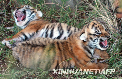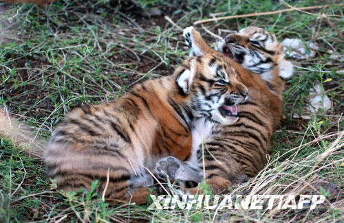 這張8月29日發(fā)布的照片顯示,兩頭華南虎幼仔在距南非約翰內(nèi)斯堡600多公里的老虎谷內(nèi)嬉戲。新華社/法新 | |