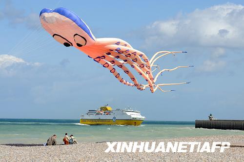 9月6日,在法國(guó)北部迪耶普舉行的第15屆國(guó)際風(fēng)箏節(jié)上,一個(gè)章魚(yú)形風(fēng)箏升空。今年的風(fēng)箏節(jié)吸引了來(lái)自38個(gè)不同國(guó)家和地區(qū)的愛(ài)好者參加。新華社/法新
