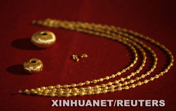 10月21日,一些考古發(fā)掘出土的金首飾在保加利亞索非亞國家歷史博物館展示。新華社/路透