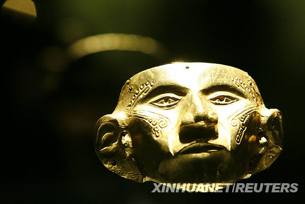 這是10月30日在哥倫比亞首都波哥大黃金博物館里拍攝的古代美洲文明的金面具。據(jù)介紹,這座世界最著名的黃金博物館新近又收入了1479件古代印第安藝術(shù)品。當(dāng)年,西班牙殖民者為了尋找傳說中的“黃金國”,毀滅了南美洲輝煌的印第安文明。如今,這些遺留下來的印第安藝術(shù)品已經(jīng)成為全人類的珍貴文化財富。新華社/路透