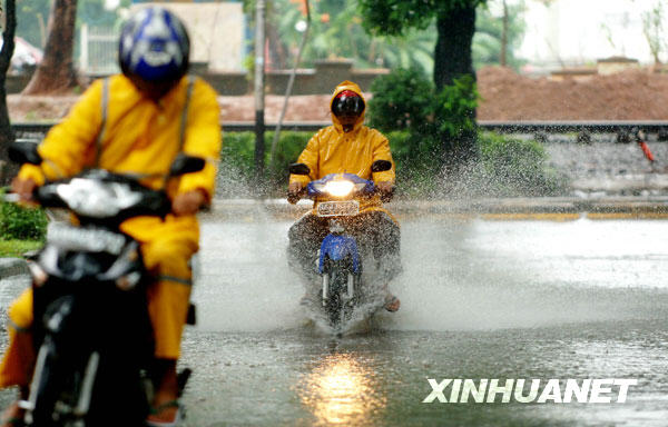 11月3日,在印度尼西亞首都雅加達(dá),兩位市民騎著摩托車在雨中前行。