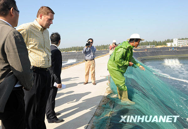 11月10日,美國沃爾瑪集團(tuán)副總裁查理斯·雷德菲爾德(左二)在國聯(lián)水產(chǎn)公司參觀高位養(yǎng)蝦池。 | |