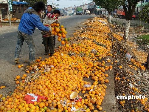 2008年11月10日,湖北宜昌市夷陵區(qū)鴉鵲嶺鎮(zhèn),被當(dāng)成垃圾傾倒在路邊的柑橘隨處可見。據(jù)悉,受四川廣元“蛆柑”事件影響,沒有出現(xiàn)疫情的湖北省柑橘外銷曾一度全面停滯,經(jīng)有關(guān)有關(guān)部門“救市”后,目前銷售量已恢復(fù)到正常水平的85%,但柑橘收購價較往年暴跌,而且收購商對柑橘的大小、品相等要求嚴(yán)格,導(dǎo)致大量“等外品”柑橘被當(dāng)成垃圾倒掉,經(jīng)濟(jì)損失慘重,成為橘農(nóng)們的錐心之痛。 |