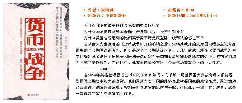 據(jù)說在華爾街常年流行著一句話:美聯(lián)儲主席只是一個木偶。今年格林斯潘出版了他的回憶錄《繁榮的年代》。9月18日《紐約時報》刊登的一篇書 評,題為“經(jīng)濟學家的生活,由爵士樂主題伴奏”。對于格林斯潘的一生,書評作者的基本評價是一曲主題音樂的伴奏者而非主角,并寫道:“作為中央銀行行長, 他也算人盡其才物盡其用。留下來的問題是,我們大家為什么不能實事求是地看待格林斯潘,而聽任他被放大很多倍?”如果事實真是如此,也就是說美國貨幣金融 這臺大戲的真正主角躲在了幕后,那么后臺老板是誰呢?按照《貨幣戰(zhàn)爭》的邏輯,他們只能是那些“國際銀行家”們。不無遺憾的是,宋鴻兵先生雖然把那層罩在 美聯(lián)儲上的面紗給揭開了,卻沒有把相關(guān)細節(jié)講全說透,故事選取也多少有些支離破碎。我記得著名金融題材作家馬丁·邁耶寫過一本名為《美聯(lián)儲》的書,很不錯 的,并已經(jīng)被翻譯成中文。閱讀此書多少可以彌補《貨幣戰(zhàn)爭》的某些細節(jié)欠缺。