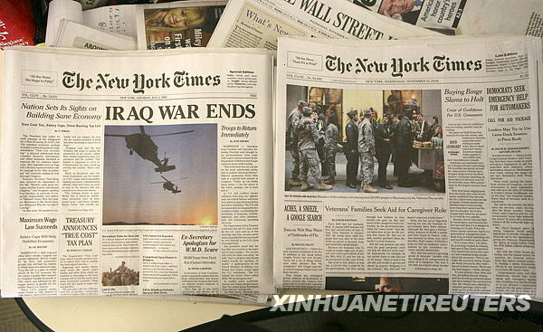 11月12日早晨,一群由教師、記者等職業(yè)人士組成的志愿者隊伍在美國紐約、費城、華盛頓、芝加哥、洛杉磯、舊金山等大城市向人們發(fā)放了約120萬份偽造的《紐約時報》,標明的發(fā)行日期是2009年7月4日,報道中宣布伊拉克戰(zhàn)爭、阿富汗戰(zhàn)爭、經濟危機、全球變暖等問題均已解決。這份假報紙的策劃者們稱此舉是為了鼓勵當選總統(tǒng)奧巴馬恪守承諾。