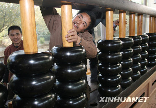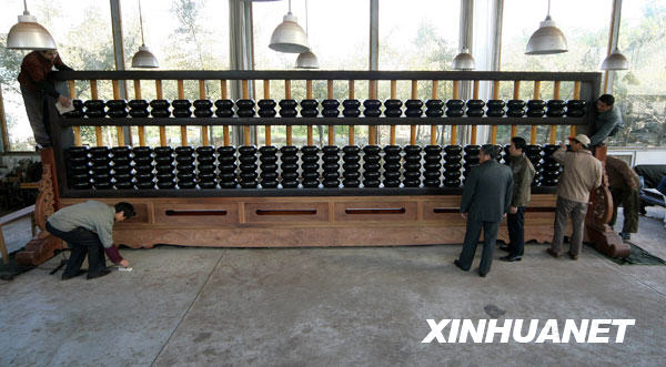 11月13日,工人對剛裝配完畢的巨型算盤進行最后的整理。