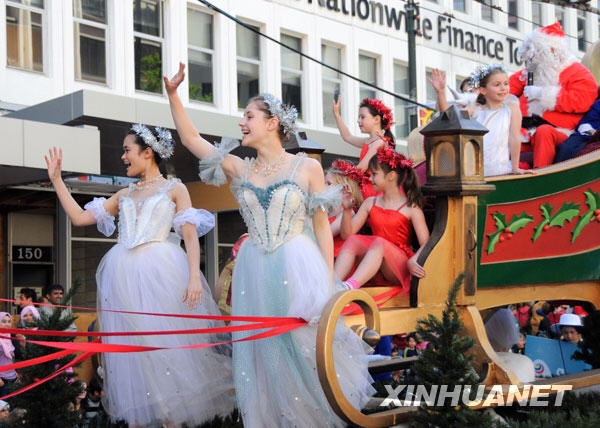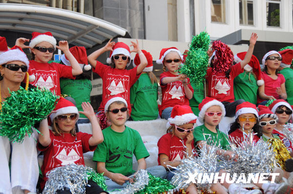 11月16日,在新西蘭首都惠靈頓,當(dāng)?shù)貎和碇フQ服裝參加花車游行。當(dāng)天,惠靈頓市政府舉辦一年一度的圣誕大巡游活動,當(dāng)?shù)孛癖娂娂娪可辖诸^,享受明媚陽光,感受圣誕氣氛。