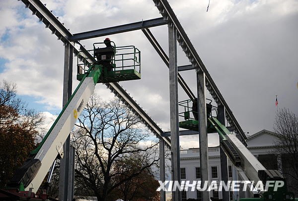 11月18日,在美國(guó)首都華盛頓白宮前,工人們?cè)诖罱ǹ偨y(tǒng)就職儀式使用的臺(tái)子,F(xiàn)年47歲的奧巴馬11月4日當(dāng)選美國(guó)第44任總統(tǒng),他將于明年1月20日正式就職。新華社/法新