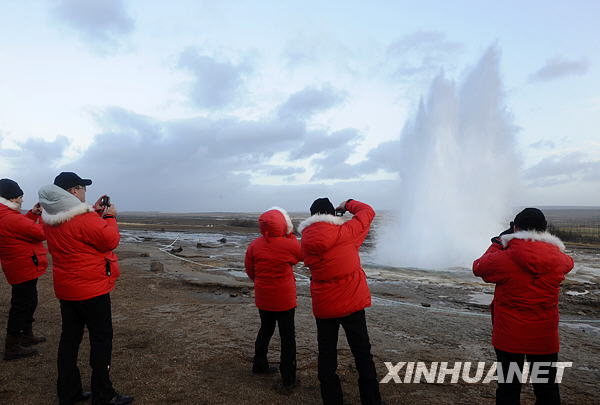 11月19日,游客在冰島首都雷克雅未克北部著名的間歇泉拍照。