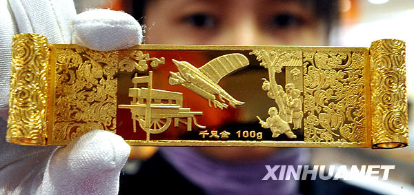 寧夏珠寶城出售的千足金“中國(guó)古代四大發(fā)明”——造紙術(shù)(11月23日攝)。