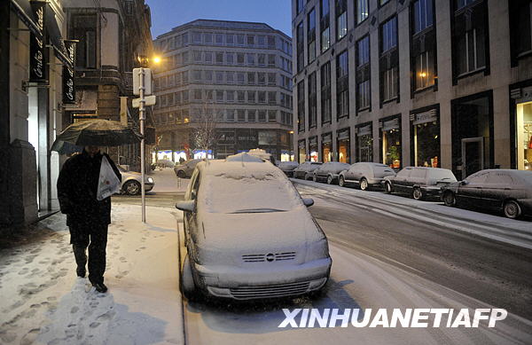 11月23日,在比利時(shí)首都布魯塞爾,一名男子走過雪后的街道。新華社/法新
