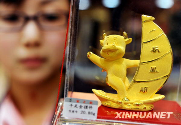 12月1日,山東省青島市一家金店店員在展示“一帆風(fēng)順”千足金擺件。