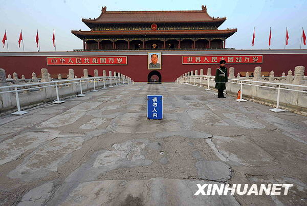 天安門金水橋(12月9日攝)。據(jù)北京市文物局9日透露,為迎接2009年國(guó)慶60周年,確保游客和文物安全,北京市文物局已于近日啟動(dòng)了天安門金水橋加固修繕工程,整個(gè)工程預(yù)計(jì)將于2009年5月完工。天安門金水橋是整個(gè)天安門景觀的重要組成部分,因游客眾多以及風(fēng)化等自然因素,天安門金水橋橋面此前多處出現(xiàn)破損,欄桿部分也出現(xiàn)裂縫,存在一定的安全隱患。