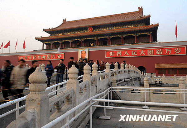 12月9日,游客從天安門金水橋上走過。