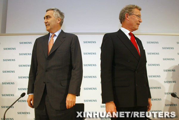 12月15日,在德國慕尼黑,西門子公司總裁彼得· 勒舍爾(左)和監(jiān)事會主席格哈德·克羅默準(zhǔn)備出席新聞發(fā)布會。據(jù)德國西門子網(wǎng)站當(dāng)日公布的消息,西門子公司以支付約10億歐元(13億美元)罰金的代價,于當(dāng)日結(jié)束了美德兩國指控其向政府人員行賄的官司。新華社/路透