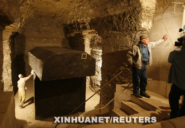 12月22日,在埃及首都開羅南部的塞加拉地區(qū),埃及最高文物委員會主席扎!す咚乖谝蛔掳l(fā)現(xiàn)古墓的考古現(xiàn)場向媒體介紹情況。埃及考古學家近日在塞加拉地區(qū)發(fā)現(xiàn)了兩座4300年前的古墓,歷史可以追溯到埃及古王國時期第五和第六王朝,考古學家表示該地區(qū)還有更大的墓地群未被發(fā)掘。 新華社/路透