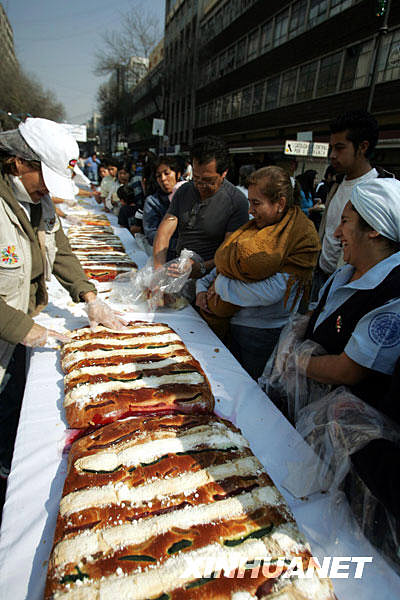 當(dāng)日,墨西哥國(guó)家面包工業(yè)商會(huì)在墨西哥城的11月20日大街舉行制作大面包活動(dòng)。制作的面包長(zhǎng)1600多米,重達(dá)1萬(wàn)多公斤。制作這個(gè)大面包消耗了6600公斤面粉,3000公斤奶油,44000個(gè)雞蛋,1500升牛奶,2000公斤食糖等。共有2300人從4日凌晨3點(diǎn)開(kāi)始制作,直到6點(diǎn)結(jié)束,耗資100萬(wàn)比索(1美元約合13比索)。 |