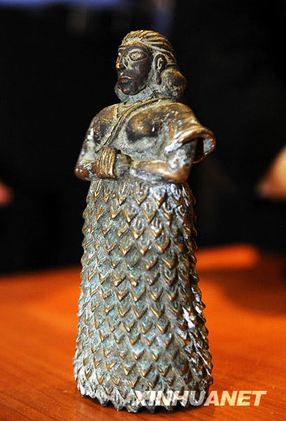 這是1月11日拍攝的埃及歸還給伊拉克的一尊兩河文明時期的銅像。當(dāng)日,埃及最高文物委員會主席哈瓦斯代表埃及將一尊兩河流域文明時期的婦女銅像歸還給伊拉克政府。2005年,一名埃及人試圖將這尊銅像走私進(jìn)入埃及時被埃及海關(guān)查獲。經(jīng)埃及文物部門的考證和鑒定,銅像創(chuàng)作于兩河流域文明時期,描繪的是一名正在祈禱的婦女。