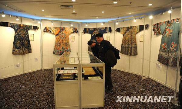 1月14日,來賓在預(yù)展上觀賞拍品。當(dāng)日,北京北緯四十度大成國際拍賣公司(北緯拍賣)在北京舉行新聞發(fā)布會暨拍品預(yù)展,宣布包括30件清宮龍袍在內(nèi)的40件珍貴宮廷藝術(shù)精品將在1月16日舉行的北緯首拍會上進(jìn)行拍賣。