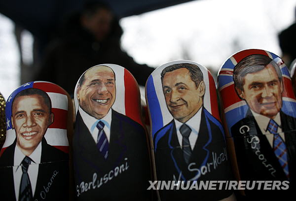 1月19日,在保加利亞首都索非亞的一家商店里,繪有美國當(dāng)選總統(tǒng)奧巴馬頭像的俄羅斯套娃(左一)與國際政壇人物套娃擺放在一起。新華社/路透