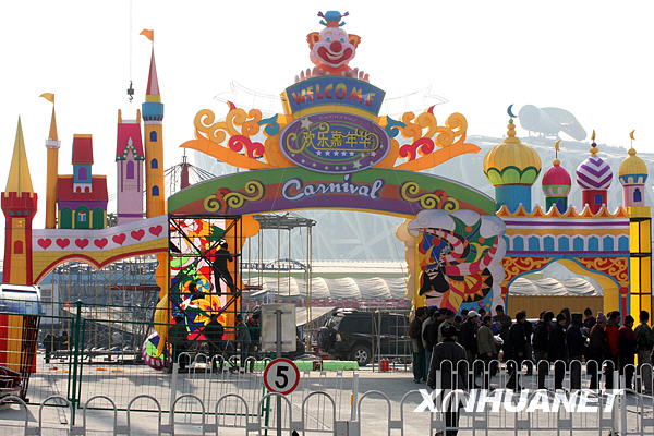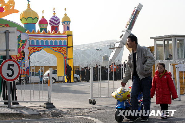 1月19日,工人們?cè)谖挥趪?guó)家體育場(chǎng)“鳥(niǎo)巢”東北側(cè)的嘉年華主題公園內(nèi)施工。目前,北京奧運(yùn)中心區(qū)內(nèi)正在加緊建設(shè)嘉年華主題公園,該項(xiàng)目占地約4萬(wàn)平方米,將于春節(jié)前后向市民開(kāi)放。