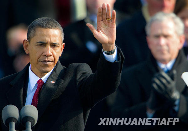 1月20日,在美國(guó)第44任總統(tǒng)就職典禮上,新任總統(tǒng)貝拉克·奧巴馬(左)宣誓后向民眾揮手致意,前任總統(tǒng)喬治·W·布什(右)鼓掌表示祝賀。新華社/法新
