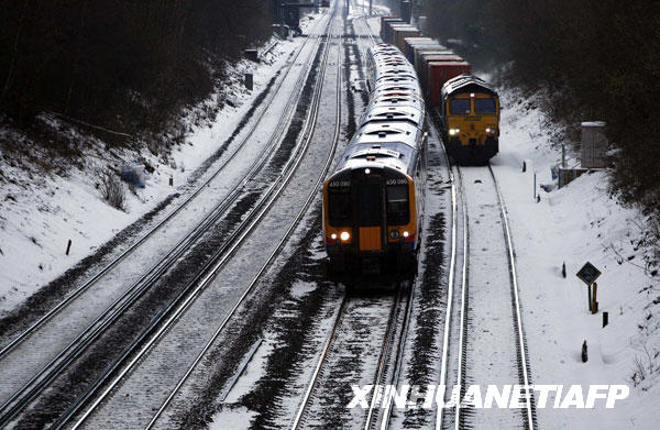 2月3日,在英國漢普郡,一列客車在布滿積雪的鐵道上行駛。英國行業(yè)協(xié)會當日公布的一份調查數(shù)據(jù)顯示,大雪給英國造成的經(jīng)濟損失可能超過10億美元。如果降雪持續(xù),這一數(shù)字可能繼續(xù)上升,使本已陷入衰退的英國經(jīng)濟雪上加霜。新華社/法新