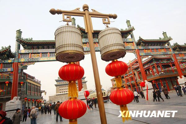 北京前門(mén)大街鳥(niǎo)籠造型的路燈上懸掛了大紅燈籠,喜迎元宵佳節(jié)(2月8日攝)。