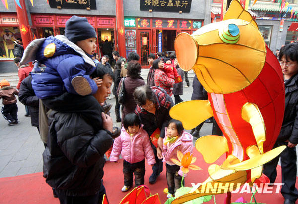 2月8日,游客在北京前門(mén)大街欣賞元宵花燈。