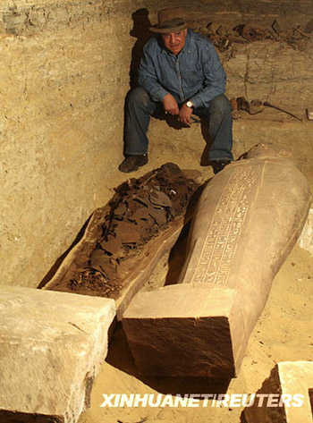 這張由埃及最高文物委員會(huì)2月9日公布的照片顯示,該委員會(huì)主席扎!す咚棺谝痪咝鲁鐾恋哪灸艘僚。新華社/路透埃及考古學(xué)家當(dāng)天表示,他們?cè)谑锥奸_(kāi)羅以南塞加拉地區(qū)一座有2600多年歷史的墳?zāi)怪邪l(fā)現(xiàn)了20多具木乃伊。該墳?zāi)箍勺匪葜凉?40年,正值第26王朝時(shí)期。新華社/法新