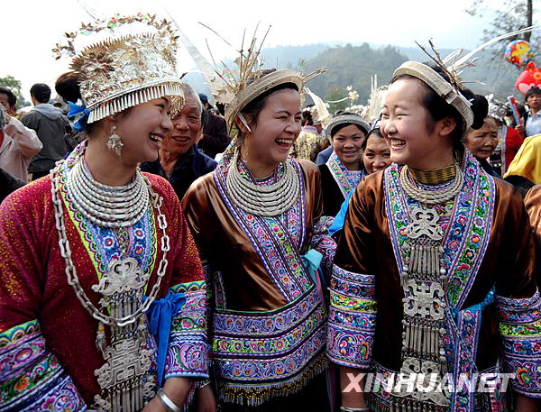 2月10日,三名苗族姑娘在歡度坡會(huì)。