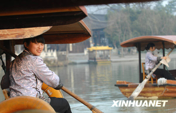 2月11日,大學生船娘錢悅(左)和同事在揚州瘦西湖上搖櫓。從2月份開始,5名畢業(yè)不久的女大學生經(jīng)過崗前培訓在揚州瘦西湖風景名勝區(qū)上崗當起了船娘,為瘦西湖平添了一道風景。
