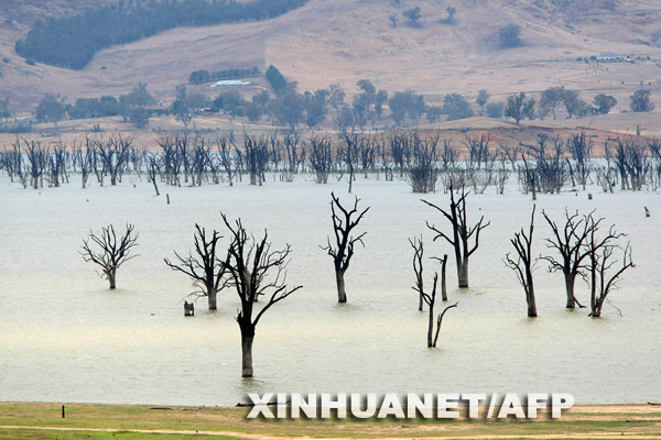 2月12日,在位于澳大利亞新南威爾士州和維多利亞州交界處的休姆水庫,由于長期干旱,原本淹沒在湖水中的植物露出了水面。長期的高溫和干旱致使休姆湖的蓄水能力減少了約2/3。新華社/法新