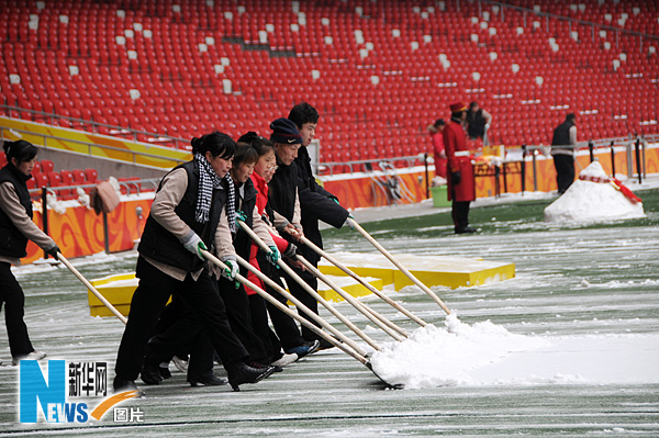 2月18日,工作人員在鳥巢場館內(nèi)清除積雪。當(dāng)日,北京再度降雪,鳥巢場館內(nèi)的工作人員及時清掃積雪以方便游客參觀。