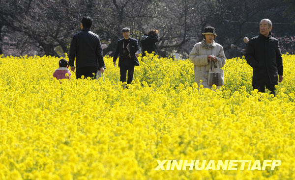 2月22日,在日本東京的一個公園里,游客們漫步在油菜花叢中。新華社/法新