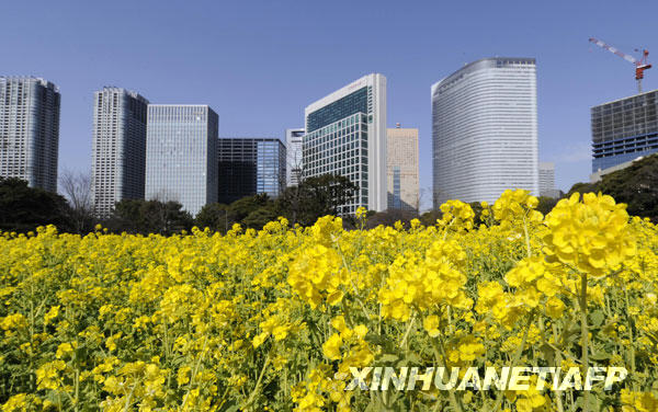 2月22日,在日本東京的一個公園里,一朵朵油菜花在高樓大廈的背景下綻放。新華社/法新