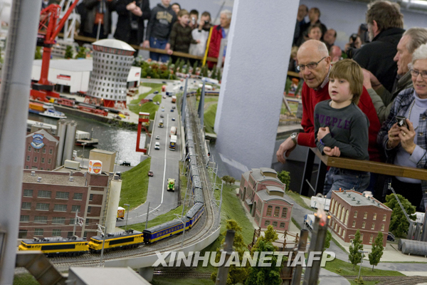 2月19日,在荷蘭城市鹿特丹,人們觀看一輛微縮玩具火車。這輛小火車約16米長(zhǎng),重12公斤,有3個(gè)火車頭。它有望打破“世界上最長(zhǎng)微縮客運(yùn)列車”的紀(jì)錄。新華社/法新