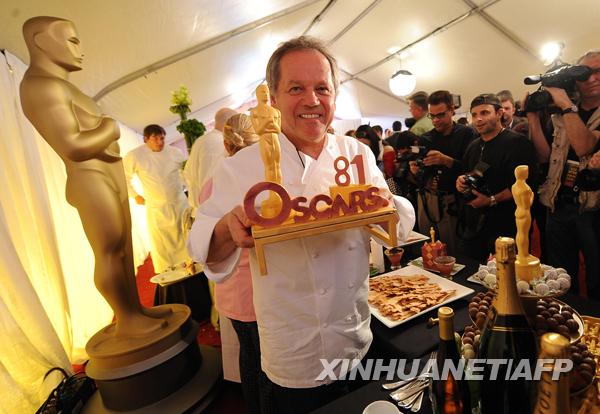 2月19日,在美國加利福尼亞州好萊塢柯達劇場外的紅地毯上,負責(zé)奧斯卡州長舞會食品供應(yīng)的主廚沃爾夫?qū)て湛讼蛎襟w展示有小金人裝飾的糕點。當(dāng)日,即將服務(wù)22日晚奧斯卡州長舞會的食品與裝飾正式向媒體亮相。新華社/法新