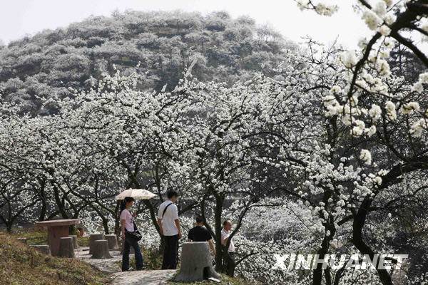 貴定縣盤江鎮(zhèn)中落海村的萬畝李樹鮮花盛開,游人在樹林間翩翩起舞(2月24日攝)。