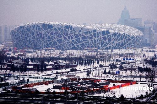 2009年2月19日,“鳥巢”迎來第二場牛年春雪。 中新社發(fā) 李吉 攝
