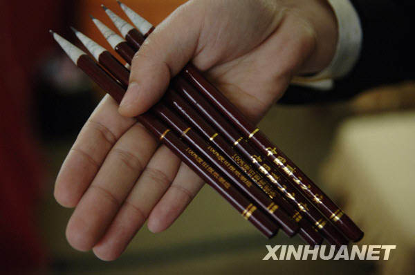 這是在安徽代表團駐地拍攝的用廢舊報紙制造的環(huán)保鉛筆(3月4日攝)。十一屆全國人大二次會議各代表團駐地紛紛采用環(huán)保鉛筆。