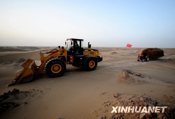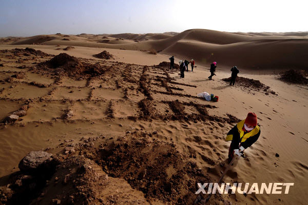 工人在黃河岸邊的劉拐沙頭用粘土壓沙障(3月4日攝)。2009年春天,內(nèi)蒙古自治區(qū)磴口縣啟動黃河岸邊劉拐沙頭綜合治理工程,計劃用3-5年的時間在劉拐沙頭建成一條大型沙漠鎖邊林帶,阻止烏蘭布和沙漠的流沙大量侵入黃河。該工程今年將投資625萬元,初步治理沙漠面積5萬畝。