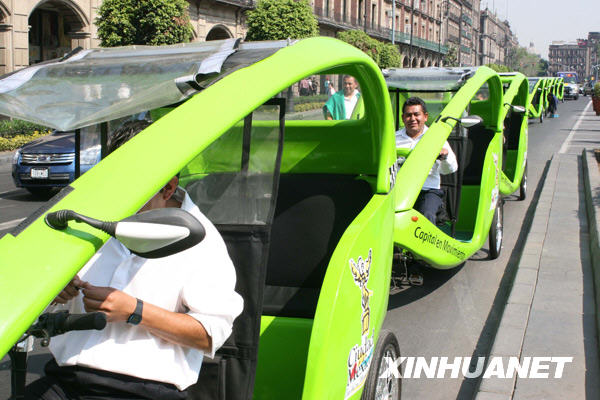 3月11日,在墨西哥首都墨西哥城,人力出租車司機在街頭等待顧客。近日,墨西哥聯(lián)邦政府在墨西哥城市中心推出了這種人力環(huán)保出租車,目的是減少機動車帶來的空氣污染。