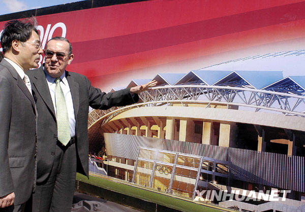 3月12日,哥斯達(dá)黎加總統(tǒng)府部長(zhǎng)羅德里戈(右)向中國(guó)駐哥斯達(dá)黎加大使汪曉源介紹體育場(chǎng)的外觀設(shè)計(jì)。