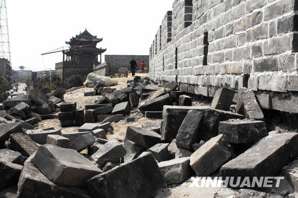 3月15日拍攝的襄陽古城墻修復(fù)施工現(xiàn)場(chǎng)。經(jīng)國(guó)家文物局批準(zhǔn),湖北襄樊市對(duì)國(guó)家重點(diǎn)文物保護(hù)單位襄陽古城墻小北門至荊州古治段的447.2米的古城墻進(jìn)行維修。維修工程主要包括對(duì)坍塌墻體和豁口處進(jìn)行恢復(fù)、內(nèi)外墻護(hù)坡加固、恢復(fù)垛堞、鋪設(shè)游路等。