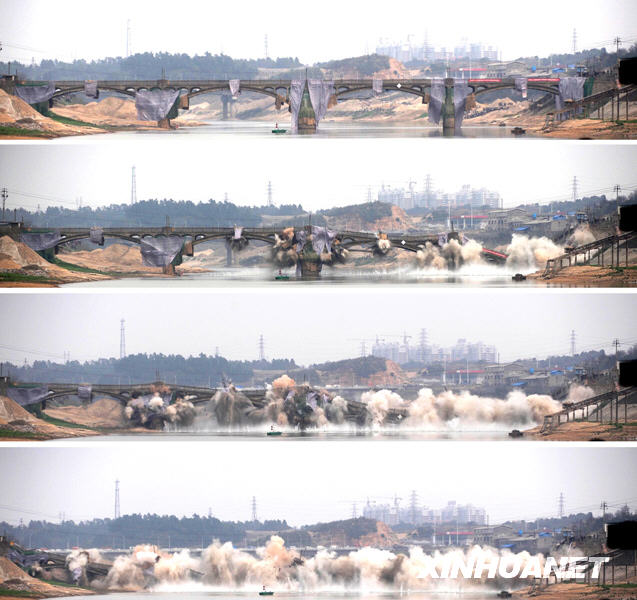 這是廖家渡大橋爆破拆除過程的拼版照片(3月17日攝)。3月17日,橫跨長(zhǎng)沙市撈刀河上的長(zhǎng)湘公路廖家渡大橋成功爆破拆除。長(zhǎng)湘公路廖家渡大橋長(zhǎng)194米,橋面寬9米,為鋼筋混凝土四跨雙曲拱橋,跨徑40余米,始建于20世紀(jì)70年代初。2008年11月,廖家渡大橋出現(xiàn)橋墩間拱肋斷裂現(xiàn)象,為防止意外事故出現(xiàn),長(zhǎng)沙市對(duì)該橋?qū)嵭蟹忾],并決定拆除重建。這次爆破采用分段微差起爆方式,從南向北分9段依次起爆,用時(shí)3秒。 | |