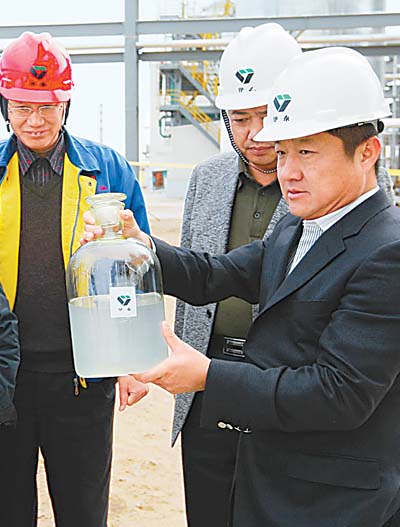伊泰集團(tuán)總經(jīng)理張東海展示煤間接液化生產(chǎn)的第一桶油。(宋海靖