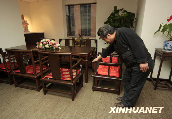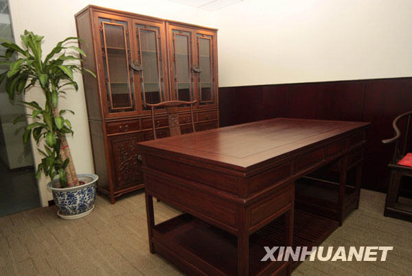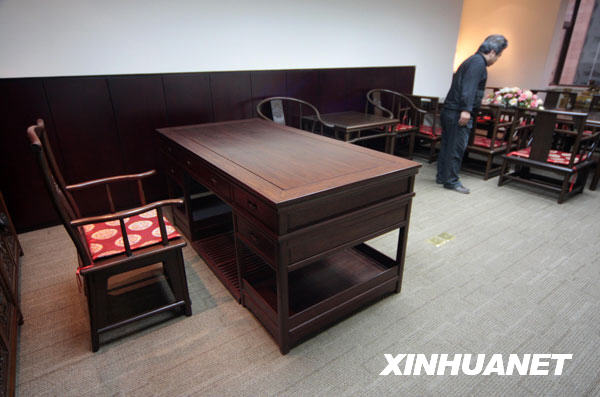 3月23日拍攝的展出的“羅格奧運辦公家具”。據(jù)悉,國際奧委會主席羅格在北京奧運會期間使用過的20件仿古風(fēng)格辦公家具將于3月底在北京拍賣。這套辦公家具以竹子為主料,包括書桌、官帽椅、書柜、會議桌椅、花幾、電視柜、圈椅等。